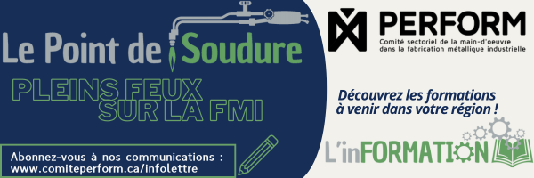 PERFORM est le comité sectoriel de main-d’œuvre (CSMO) de la fabrication métallique industrielle (FMI) au Québec. À ce titre, l’organisation contribue activement à la formation et au développement des compétences de la main-d’œuvre, à l’attraction de talents et à l’adaptation des entreprises qui œuvrent dans la fabrication de produits métalliques, de machines et de matériels de transport (à l’exception de l’aéronautique).